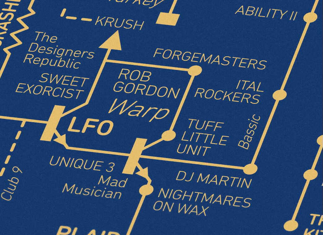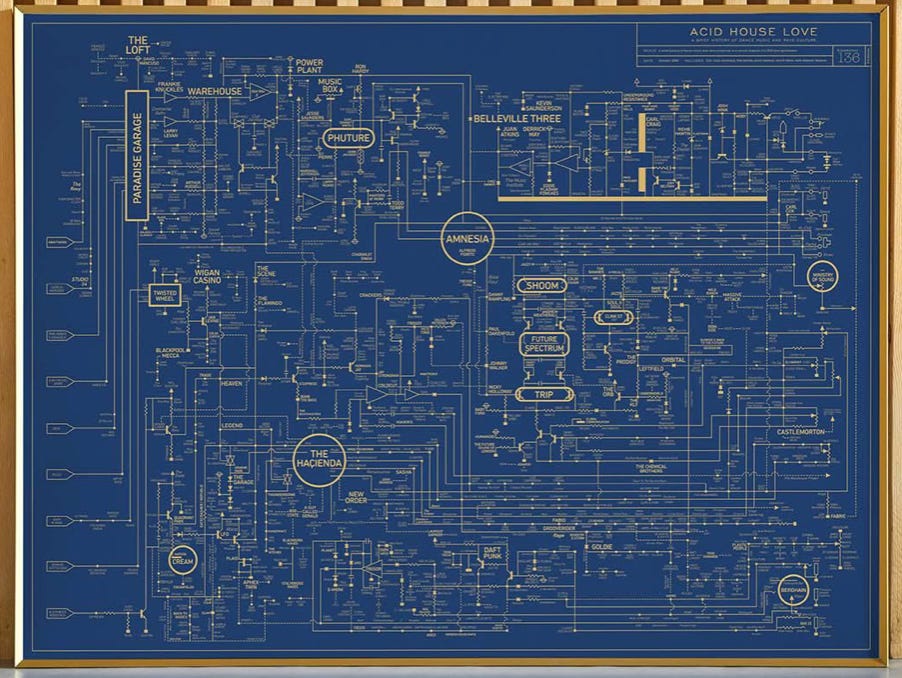 “The idea developed from just celebrating acid house to mapping the history of dance culture more broadly. We found a diagram of the Roland 303 circuit board and Jim went to town mapping my research onto it.”
