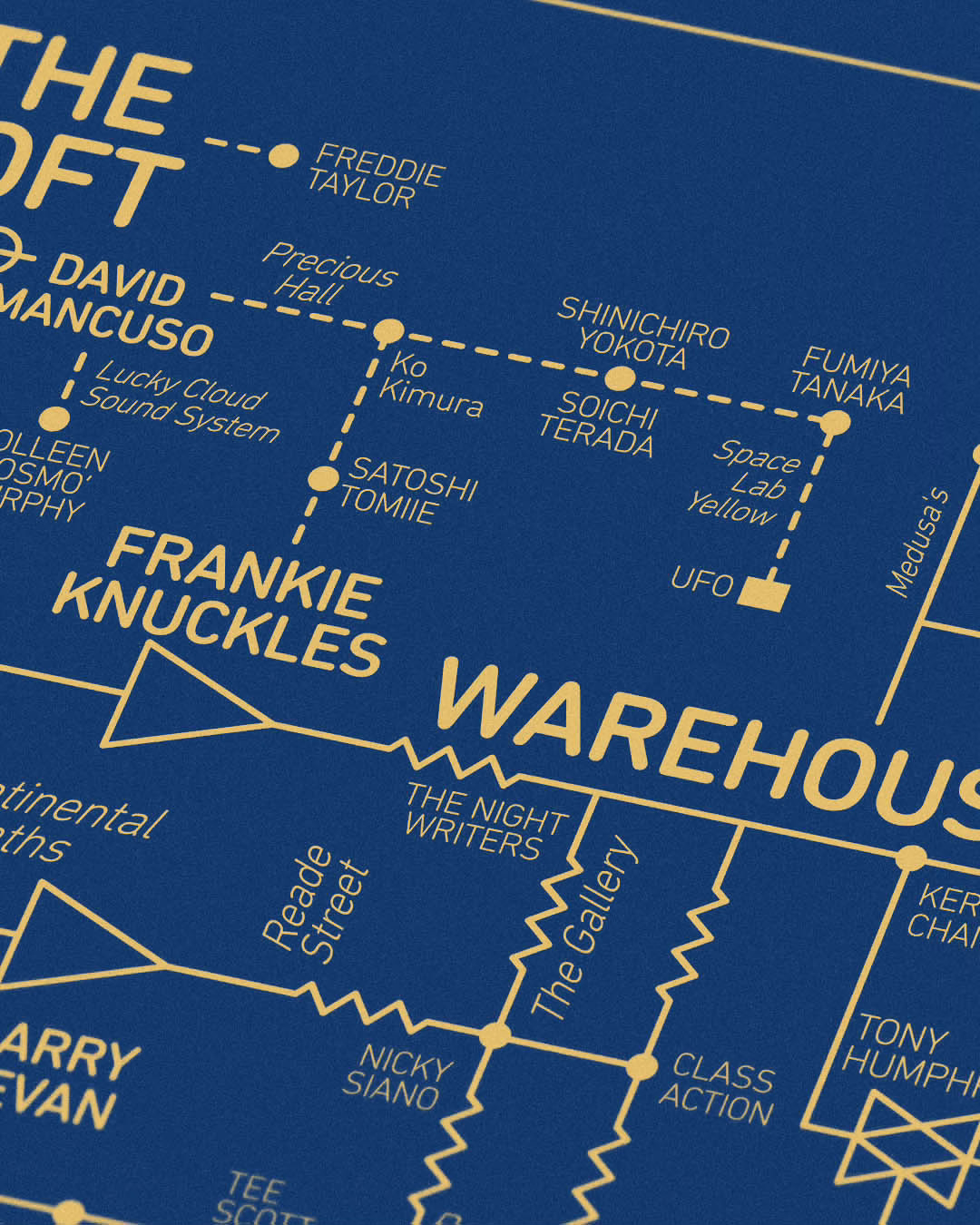 Although the grand narrative of dance culture is presented on the print through the scale and placement of the clubs and artists associated with the culture’s creation myths, we were keen to flatten out this narrative as much as possible by foregrounding some lesser known but equally important moments (the Hedonism section for instance) and very niche, often personal micro stories.